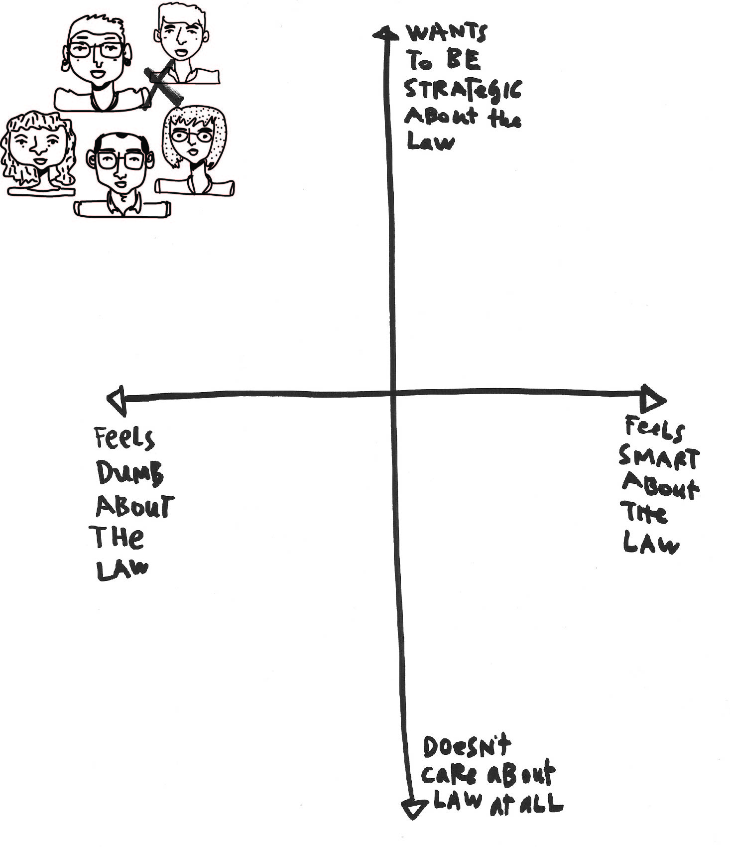 Many of these user requirements derive from some fundamental trends in lay people’ experience of the legal system. One of the most profound one is summarized in this matrix. People want to to be strategic in the legal space. They’ve seen the TV shows and the movies. They know the consequences of getting legal stuff wrong, or of navigating the system well. They have high aspirations for using this system to their advantage, and being smart.