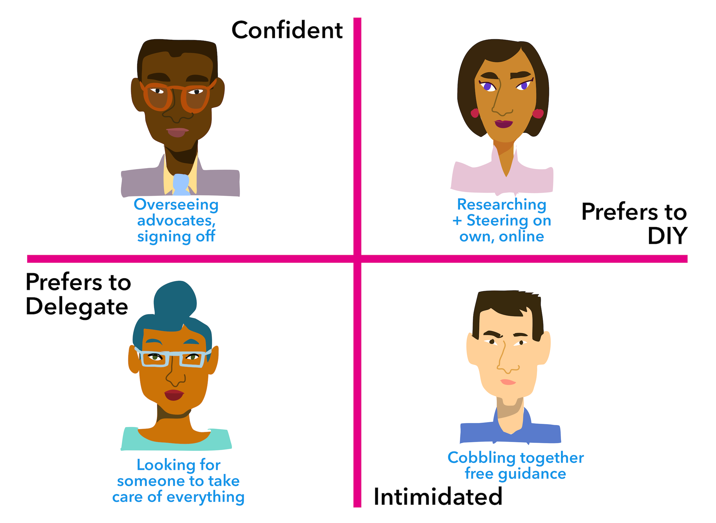 The other vector is around the desire to take care of tasks yourself versus hand them off to someone else. Irregardless of confidence in one’s ability to navigate the system, some people would rather have another ‘advocate’ take care of their legal tasks and progress. Others want to be the one in charge (and perhaps handing off some tasks), and doing as much of the work on their own.